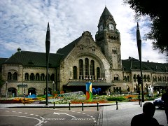 Am Montag bin ich nach Metz gereist, um dort zwei Tage lang die Stadt zu erkunden. Beim ersten Schritt aus dem Bahnhof stand dieser hier folgende Beitrag mir buchstäblich vor Augen. Nachdem ich letzte Woche über den > Arnulf-Klett-Platz in Stuttgart geschrieben habe, kann jetzt der Bahnhofsvorplatz des Bahnhofs in Metz als wunderbares Beispiel einer gelungenen Platzgestaltung dem Straßenplatz vor dem Hauptbahnhof in Stuttgart gegenübergestellt werden. Der Platz in Metz besteht im wesentlichen aus einem Halbkreis, der mit Betonplatten belegt ist. Wie bereits angedeutet, der Reisende kommt beim Heraustreten in der Stadt an, er wird auf einem Platz empfangen und muß sich nicht gleich vor den sich unmittelbar am Bahnhofseingang sich drängelnden Autos in Acht nehmen, oder in die U-Bahn flüchten. Es ist ein Vergnügen in Metz anzukommen: Das meinte ich in meinem letzten Beitrag, wenn es darum geht, das Ankommen in der Stadt zu inszenieren. Was wohl die Reisenden in Stuttgart einst entdecken werden oder zuerst sehen werden, wenn sie die Lichtkuppel verlassen? Ob dann immer noch auf dem Arnulf-Klett-Platz die Autors entlangbrausen werden? Das Wichtigste, wenn man irgendwo erscheint, ist doch immer der erste Eindruck. Und jetzt fällt der Blick nur auf die Absperrkette zwischen den 6 Spuren.