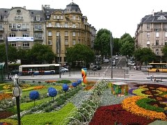 Jetzt hier nochmal der Blick von links nach rechts. Ohne Zweifel verleiht der Blumenteppich, den man auch von einem nachmittags geöffneten Balkon an der Frontseite des Bahnhofs aus bewundern kann, dem Vorplatz ein besonders charmantes Erscheinungsbild. Aber auch ohne die Blumen kann man verstehen, wie gut die Neugestaltung dieses Platzes gelungen ist. Vor dem Bahnhof gabe es bis vor zwei Jahren eine vierspurige Straße, meinte mein Stadtführer. Geht doch, dachte ich mir – Und die vielen Einwände! In Stuttgart gibt es viel mehr Verkehr. Eben weil ja die eigentlich nicht notwendige Straße über den Arnulf-Klett-Platz führt. Und man weiß vor dem Ankommen nie so recht, wo man die Lieben absetzen kann. Wird diese Frage gelöst, sind 40 Prozent des Verkehrs bereits geordnet.