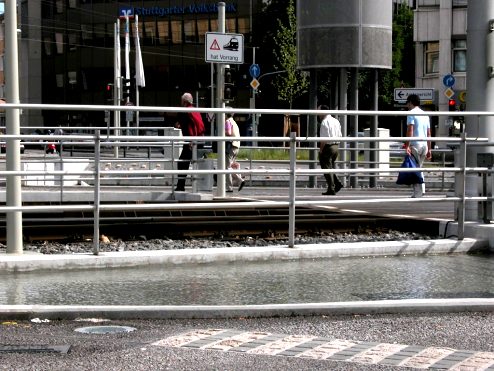 Wie schon beim (versuchten) Gang über den Wilhelmsplatz gesagt in Stuttgart bestimmen die hohen Einstiegstüren der Straßenbahnen die Anordnung und die Trennung der Verkehrsräume. Die Folgen sind fatal. Es wird nie auf Plätzen, wo solche Straßenbahnen fahren, eine Platzkultur der Begegnung entstehen können. Fußgänger müssen vor diesen gefährlichen Bahnen immer durch allerlei Mobilar in sicherer Distanz gehalten werden.